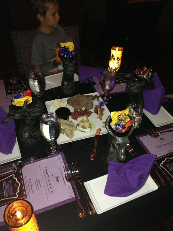 We weren’t rushed upstairs, in fact, it seemed most guests attending needed to use the restrooms and had enough time to do so before traveling to the restaurant. Once we made it upstairs, we found the already charming restaurant enhanced with table decorations, live music, and wonderful gifts. Included with your package was not only the advertised Maleficent souvenir cup, but also a Maleficent light-up drink stirrer, and the poison apple “glow-cube” that was very popular at “Villains Unleashed”. Everyone also received a commemorative menu and autograph card exclusive to the event.