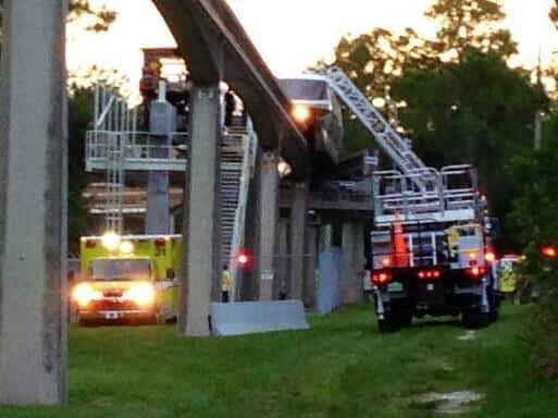 Apparently, lightning struck the beam on the Epcot monorail line this evening, stranding guests inside Monorail Gold. The train stopped in the transfer track area where the tractor could not be used to pull the monorail to a safe unloading zone. A very rare instance, the monorail needed to be evacuated via the hatch on the roof with guests pulled down from the elevated vehicle using a cherry picker courtesy of the Reedy Creek Fire Department.